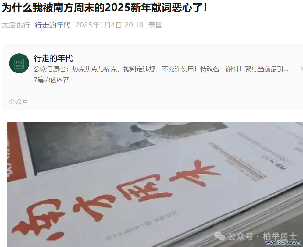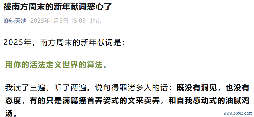 去年南周新年献词出来后,有一种文章特别流行,标题叫《我被南方周末的2025新年献词恶心到了!》《被南方周末的新年献词恶心了》。